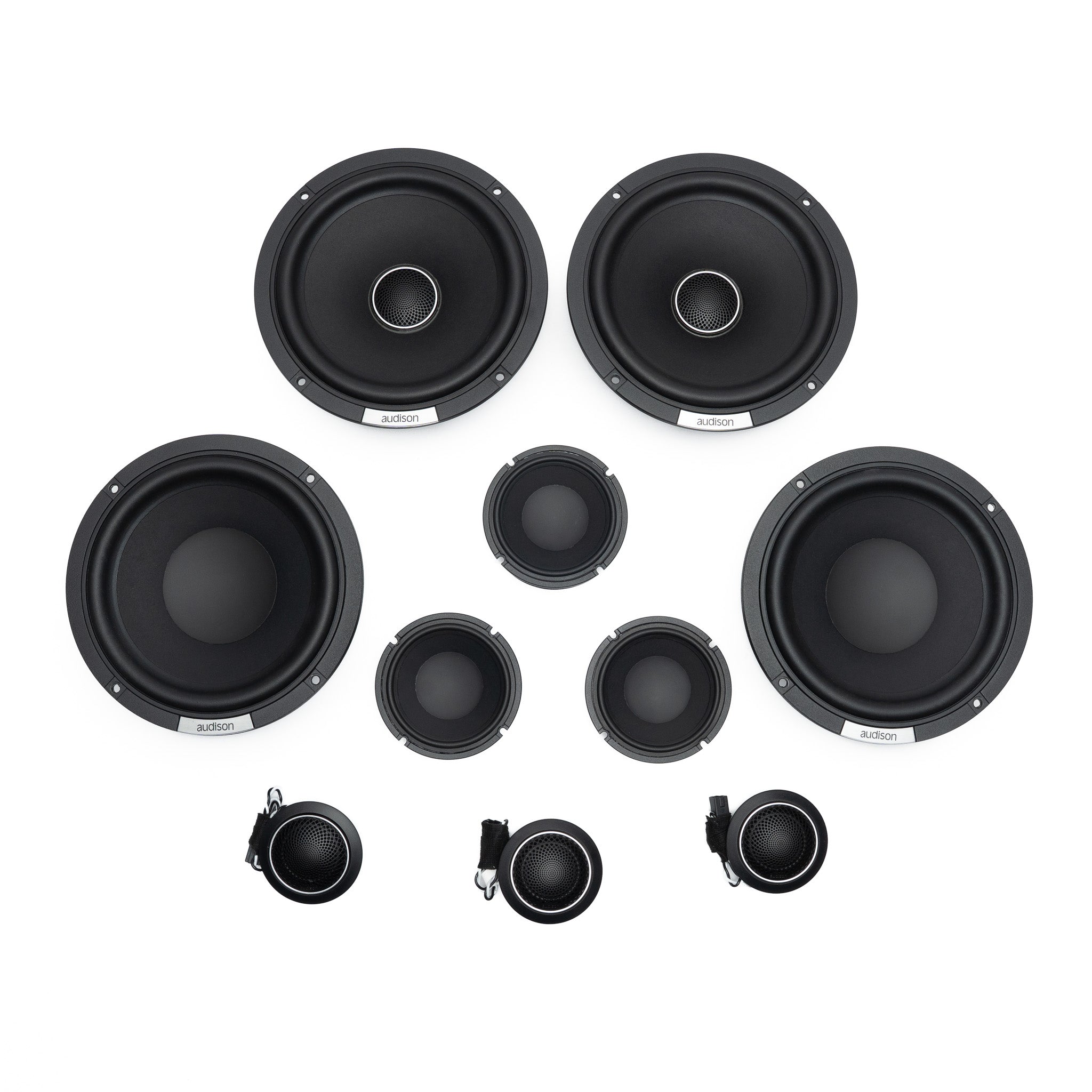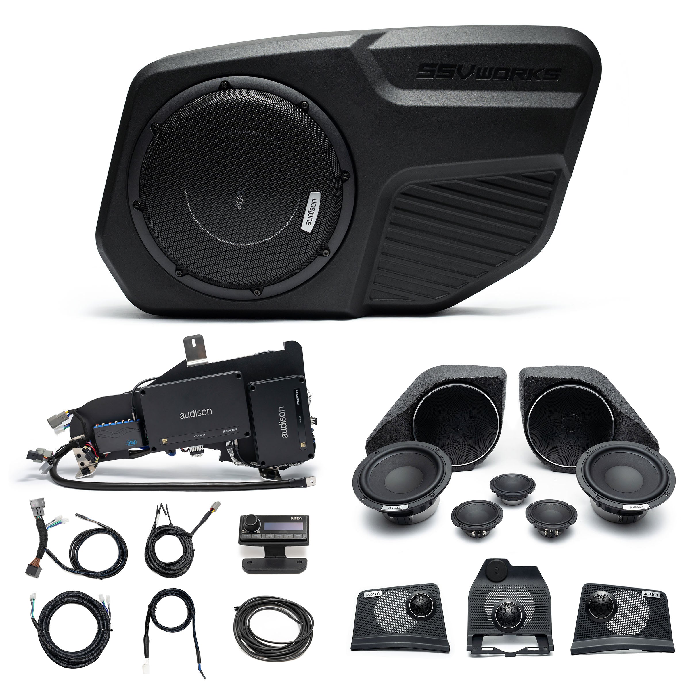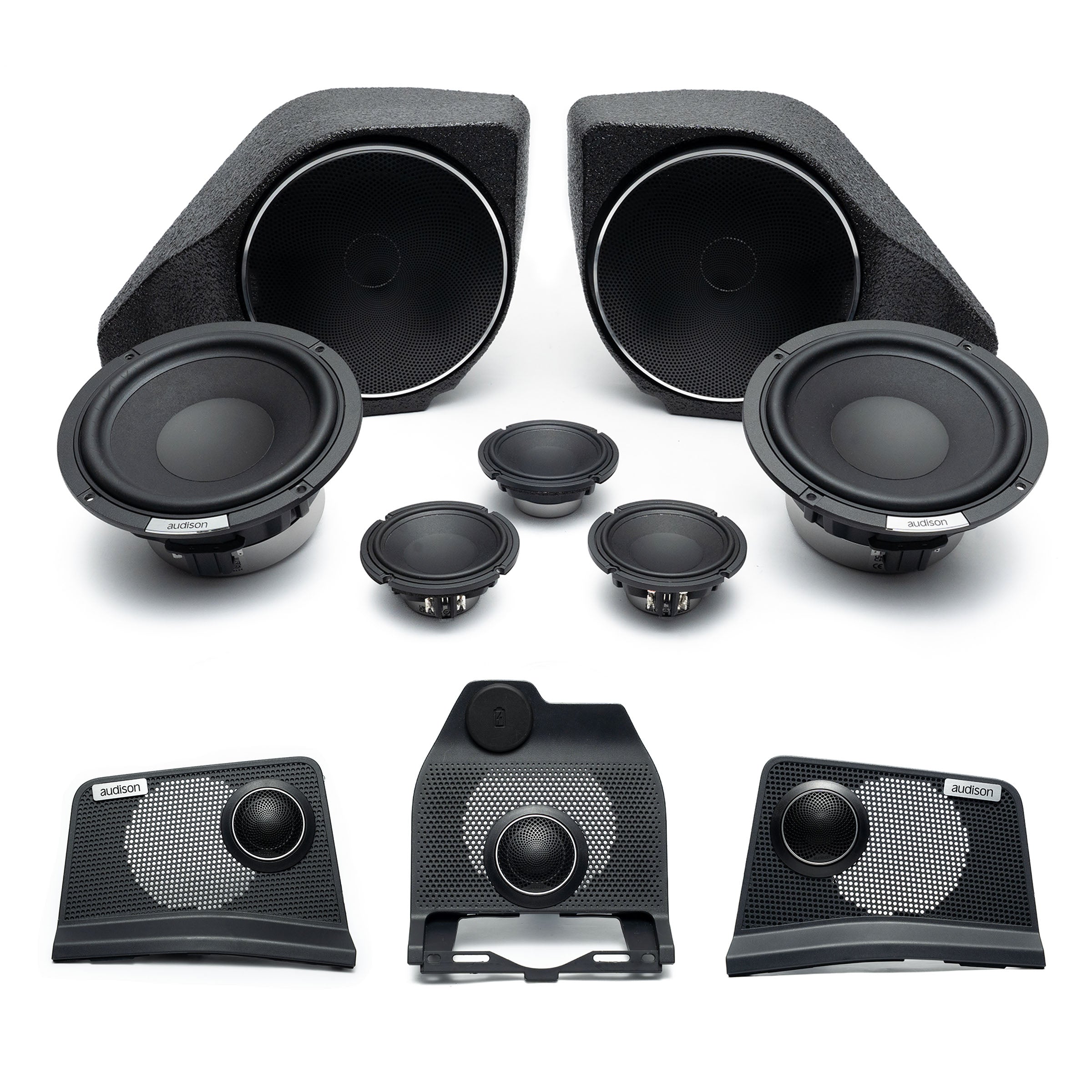 Introducing our Audison Voce II / Forza Bronco System. This premium, fully active DSP-controlled audio upgrade featuring 10 speakers plus subwoofers, is powered by three dedicated Audison Forza DSP/ amplifiers. Show casing Audison's new Voce II speakers driven by the Audison Forza DSP 8.14 and Forza 4-channel amplifiers, with a Forza Mono amplifier dedicated to power the Voce II subwoofers of your choice. It delivers a fully active 3-way front stage, a fully active 2-way center channel, and two active 6.5” rear speakers, totaling 10 DSP tuned speakers for precise staging, clarity, and impact. This 100% plug-and-play full system is configured, tested, and professionally tuned prior to shipping, ready for a complete, seamless installation!